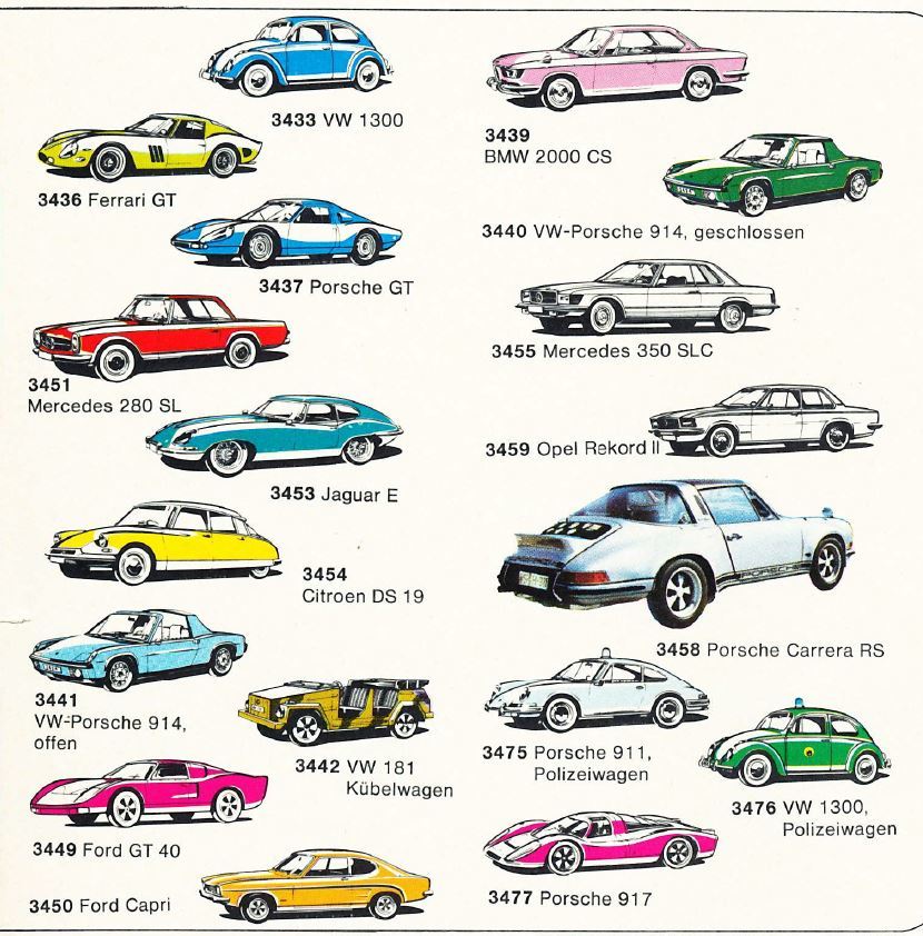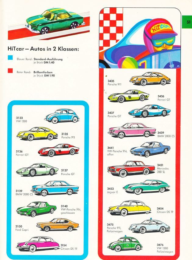 Bilerne var i 1969 i standard farver, med serie nr. 31**, men allerede året efter kom der også en udgave i forkromede udgaver med serie nr. 34**. På billedet til højre er standard biler afrundet med blå kant og forkromede med rød kant.