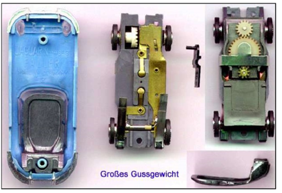 Den store støbte vægt blev normalt placeret løst oven på chassisets skruefastgørelse. Billedet viser også det meget sjældne fladankerchassis med dobbelte slæbesko.