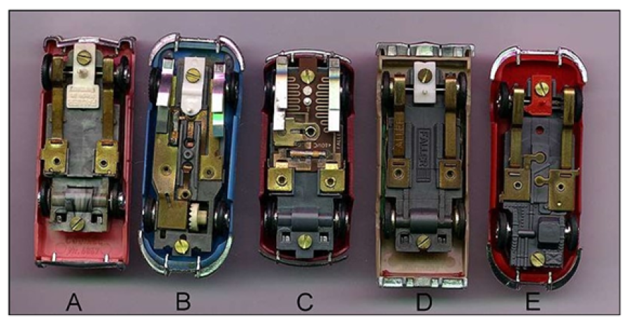 E: Styrestift med diodepil: Den sidste styrestift, som Faller fremstillede, sad på det sene pandekagechassis. Den er omtrent samme størrelse som Type D, men fås i farverne rød eller grøn. Der er også en lille pil, der peger på, hvilken side diodelæben skal placeres. Lige under styrestiften er der et kighul i chassiset, hvor man kan se magnetens farve. Stiften skal have samme farve som magneten for at bilen kører fremad, når diodetraileren er monteret.